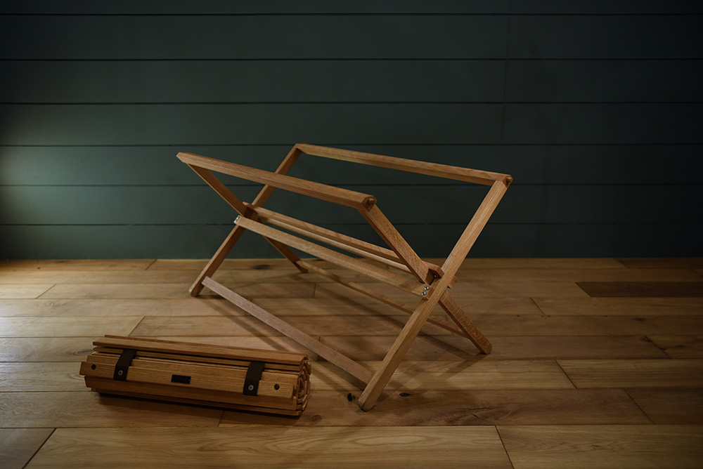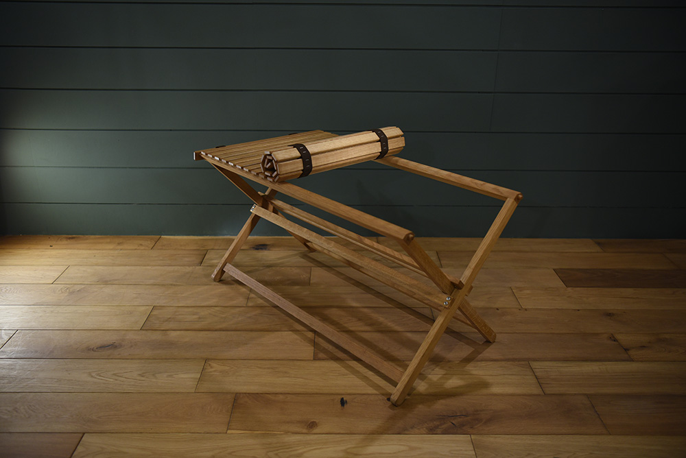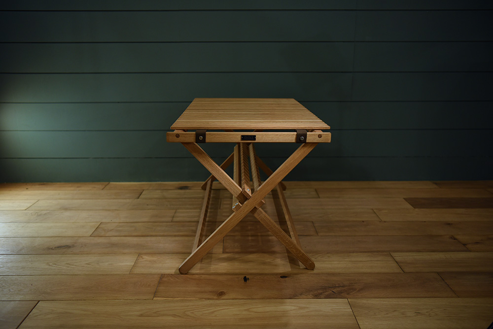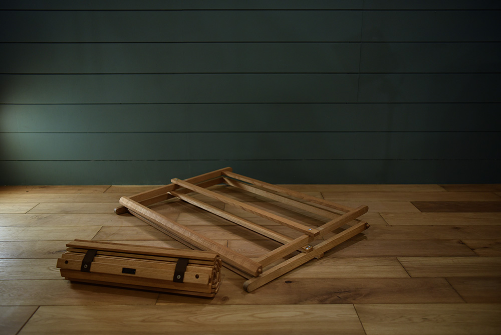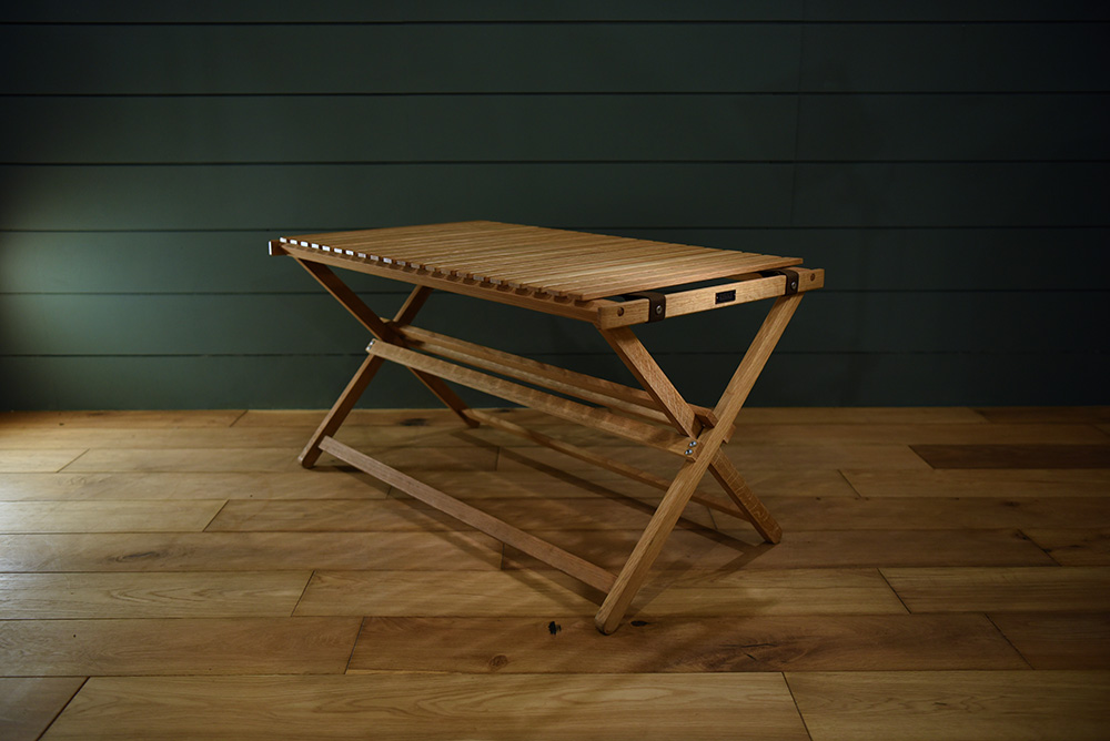 軽くて持ち運びもしやすく、コンパクトに収納可能。名前の通りテーブルの脚をクロスに組み、テーブルトップを敷くだけのシンプルな構造です。 持ち運ぶ時にはテーブルトップを丸めて外し、足を抜いたら片方をくるっと回転させてはめ込めばスリムに畳めます。 ナラ無垢組/天然由来オイル
