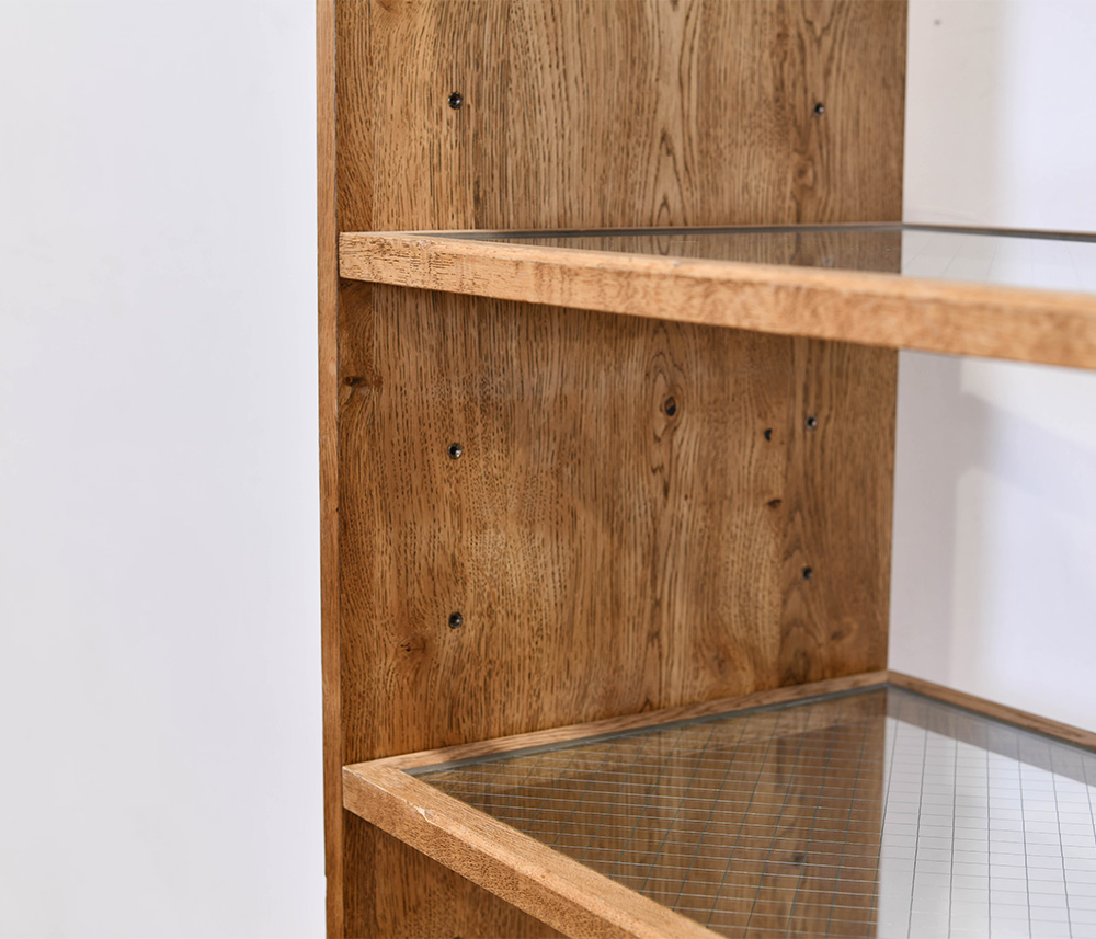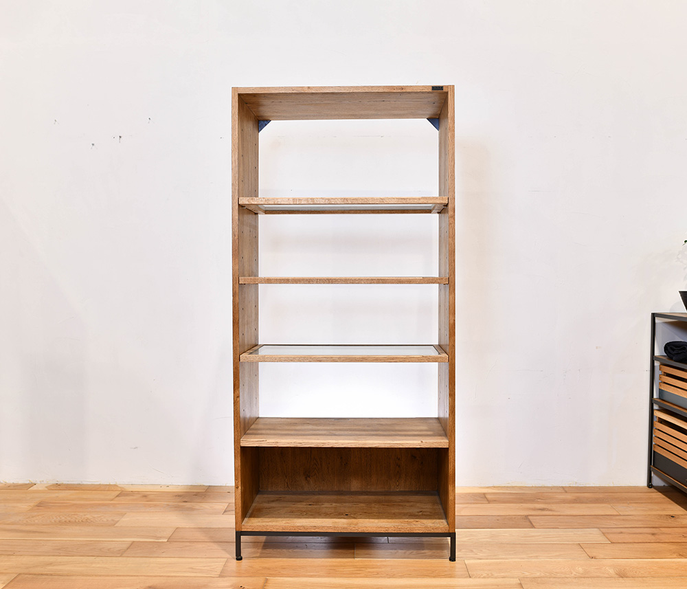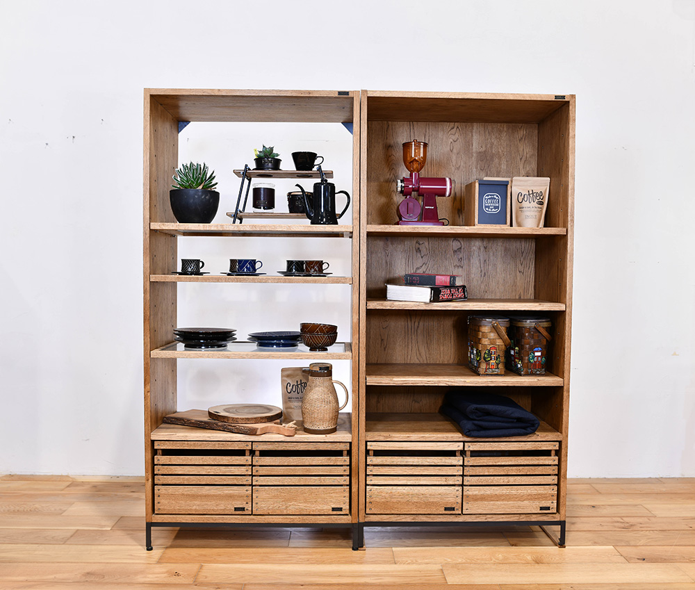収納する高さに合わせて調整できる可動棚仕様。 付属のBOXは単体での使用も可能なスタッキング式。 フレーム:ナラ天然木(BRIWAX)/スチール黒皮 BOX:タモ材集成組 WATCO仕上げ