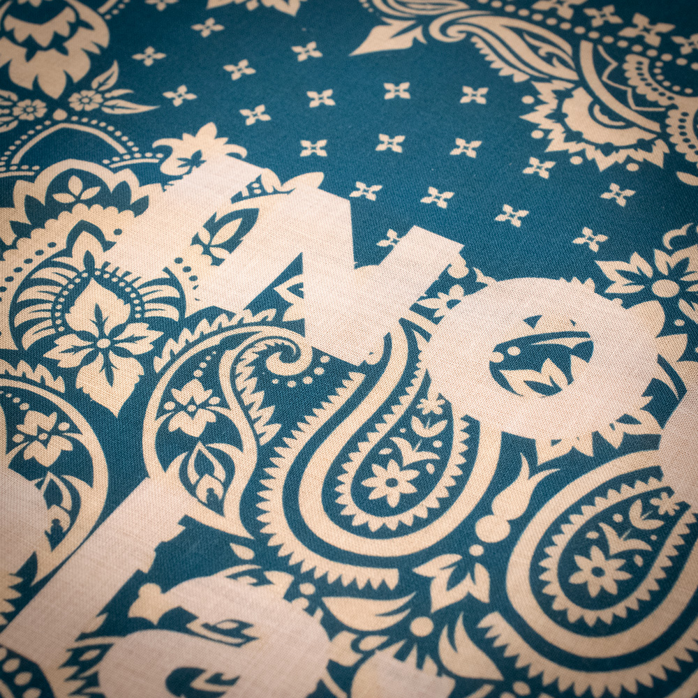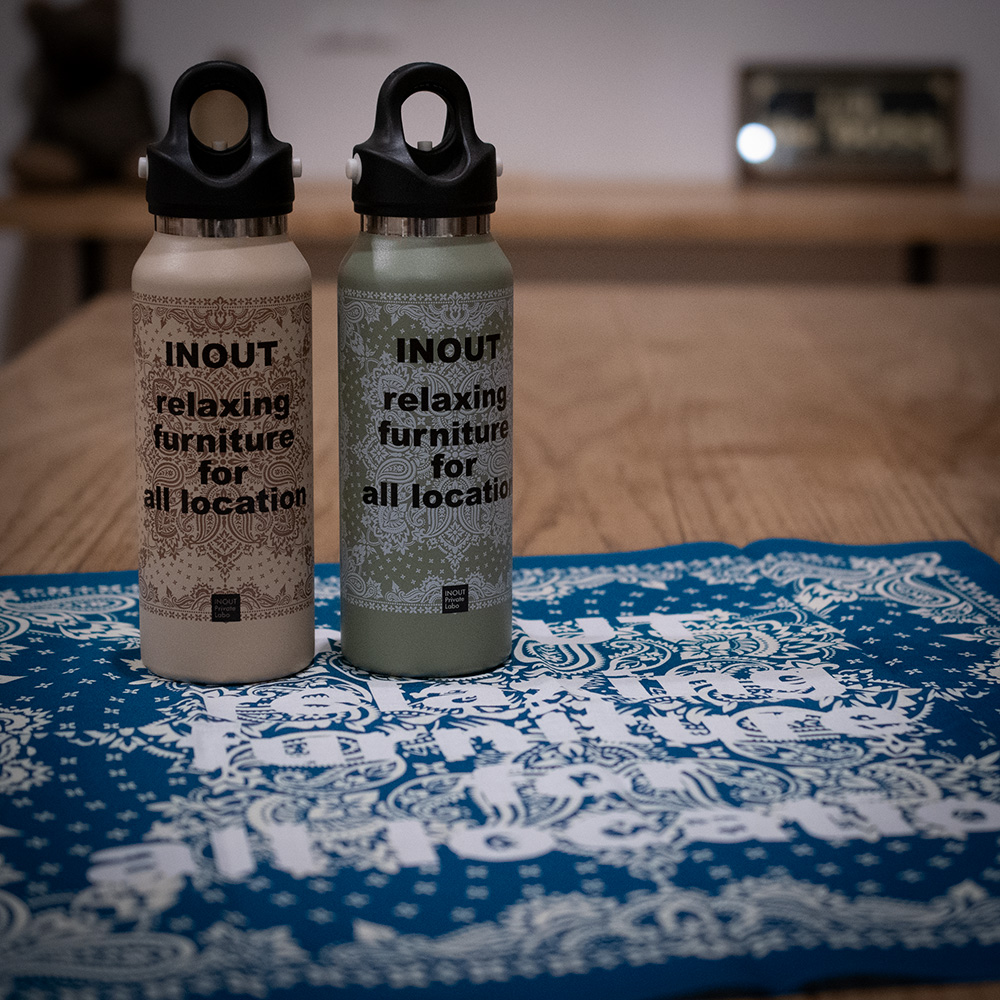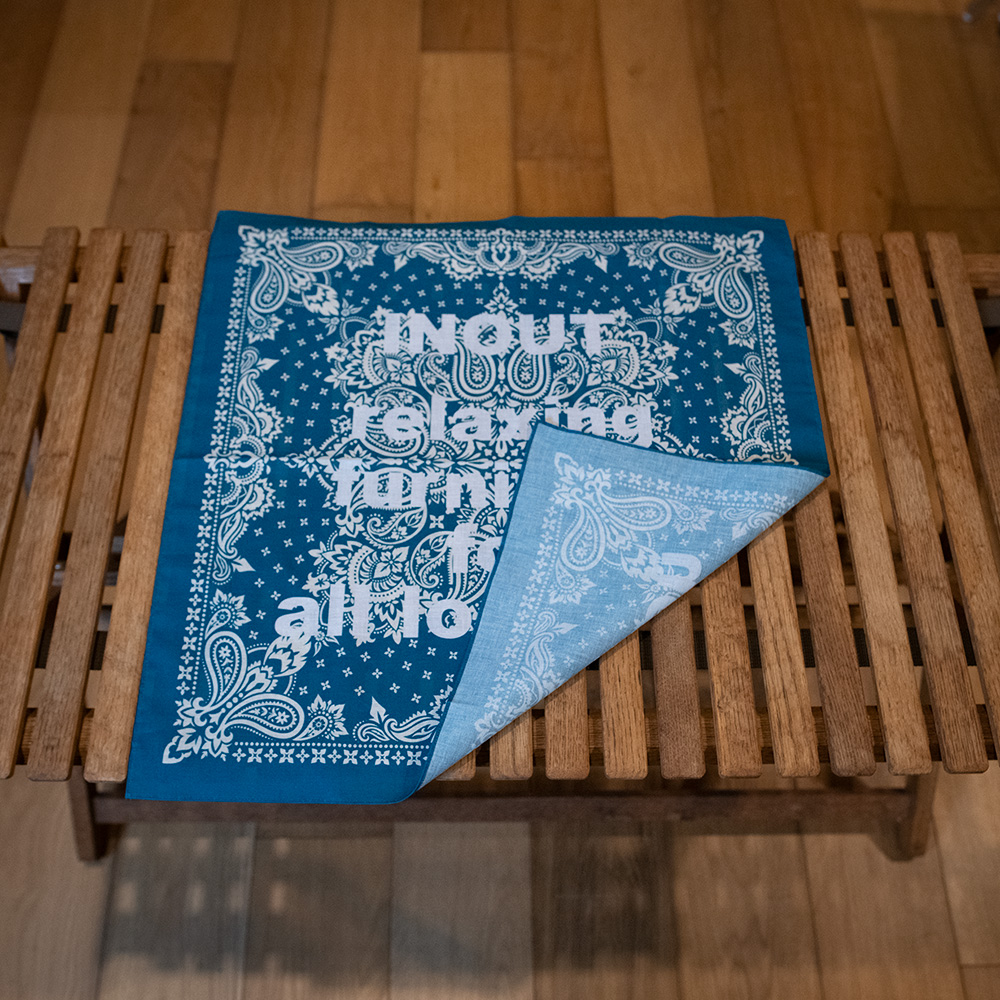 INOUTオリジナルバンダナ 52cm×52cmサイズのバンダナになります。 ペイズリー柄にINOUTのフィロソフィーを落とし込んだデザインです。 10年前に思ったINOUTの家具はどんな場所でもリラックス出来るそんな家具をデザインしていきたいとの思いをこの10周年を向かえた今再度確認する意味も込めて製作しました。 お弁当を包んだり割れ物を保護したり汗拭き用でも意外と重宝するバンダナです。 プレゼントにいかがでしょうか。