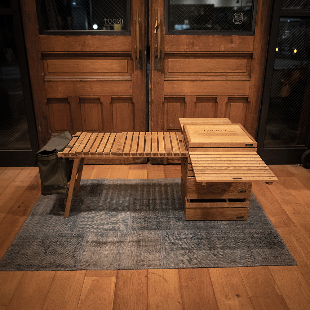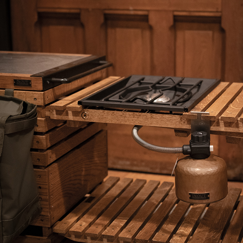 connectの新しい形 通常のconnectは組み合わせているパーツを外し、 BOXの両サイドから挿入してウイングとして使用したり BOX同士を橋渡しのように使用するパーツでした。 connect neoは2つに分裂出来ませんが、 新たな3つの機能がつきました。 ①片方に脚が出てきてテーブルとして使用可能 ※Stack Box HighとLowが1台ずつの高さ設定と なっています。 ②アタッチメントの天板を外しスノーピークの フラットバーナーが設置出来る。 ※ガス缶ホルダーのパーツは別売りとなります。 ③エンド部分に凹みを施しBox同士が ずれない様な工夫もされています。 Stack Box HighとLowが1台ずつあれば connect neoを取り付けるとサイドテーブルとなります。 また、通常のconnectのように橋渡しとしてもお使い頂けます。 写真はvintage仕上げです。通常のOAKやwalnutもございます。 ワックス仕上げは一時的に水をはじく事は出来ますが 長時間濡れたままにしておくと染みになってしまいます。 濡れた場合は乾いた布等でお早めにお拭き下さい。