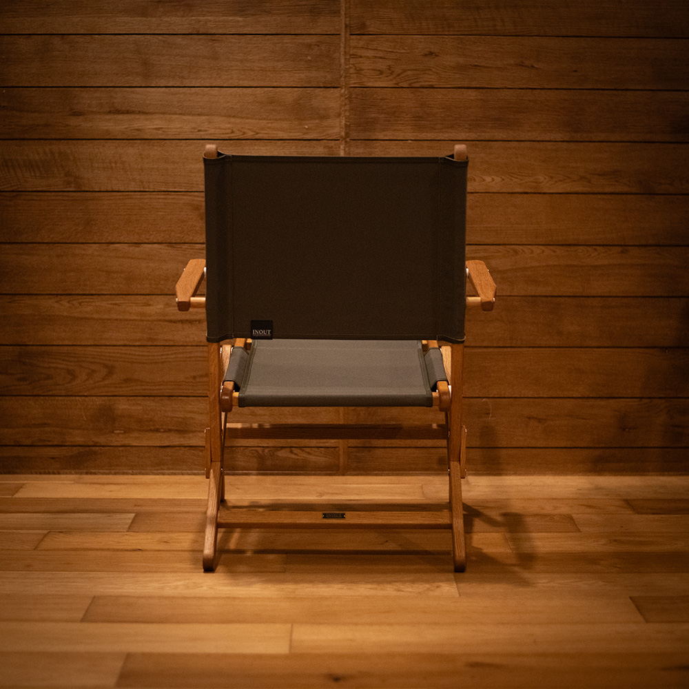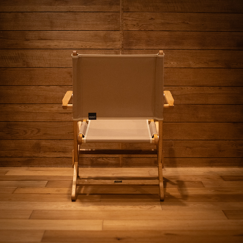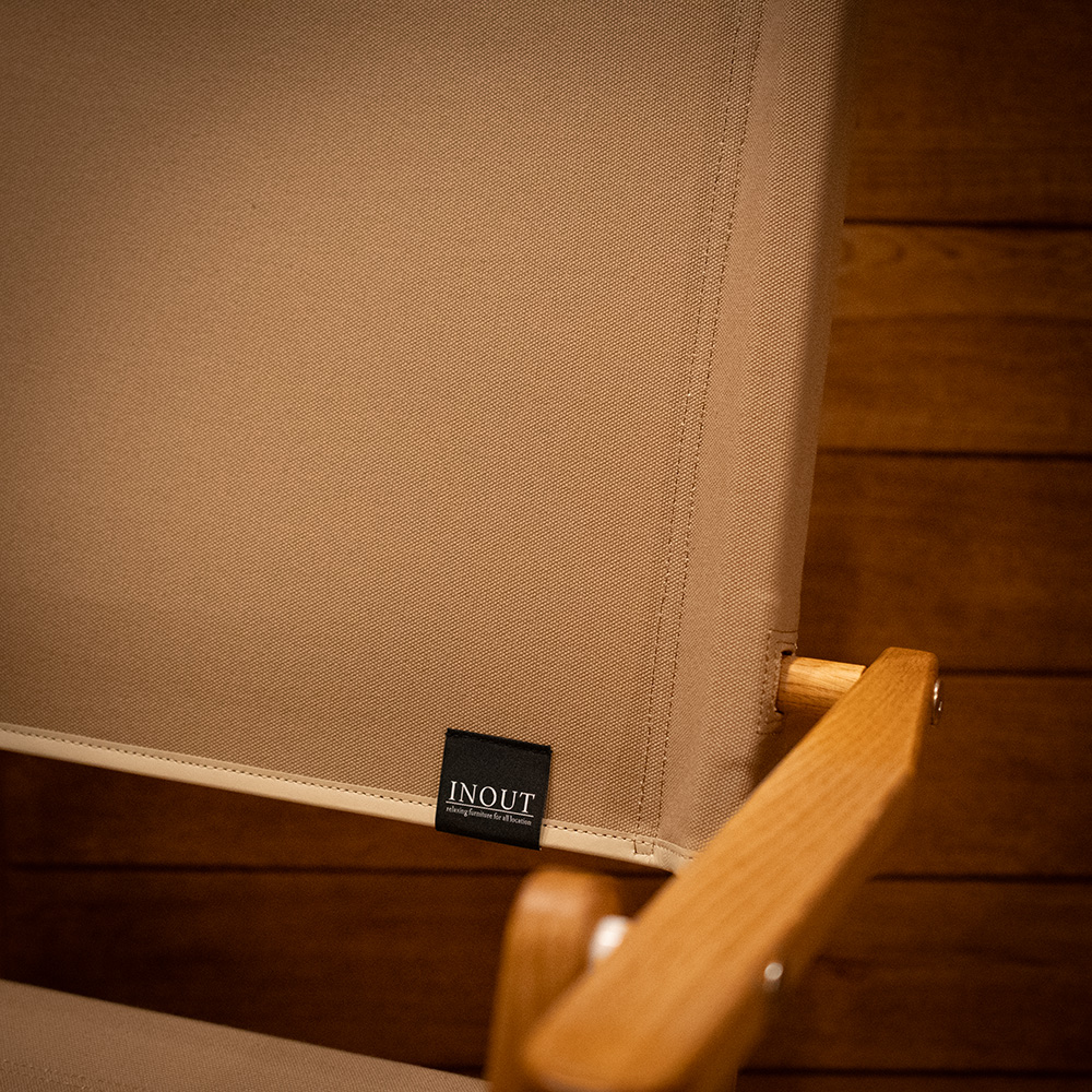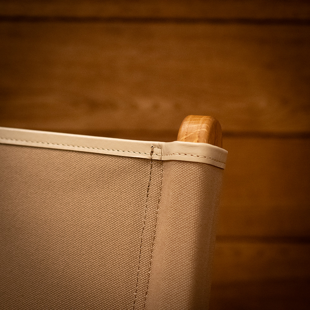 Designed for long, comfortable sitting, the seat height is carefully tuned to reduce fatigue, and the cross-woven upholstery keeps sagging to a minimum. The fabric edge has been upgraded from canvas to leather piping for a more premium feel, and an INOUT metal plate is mounted on the back leg. We use Kurashiki Canvas, known for its toughness and low stretch, so you can enjoy the chair for years.
