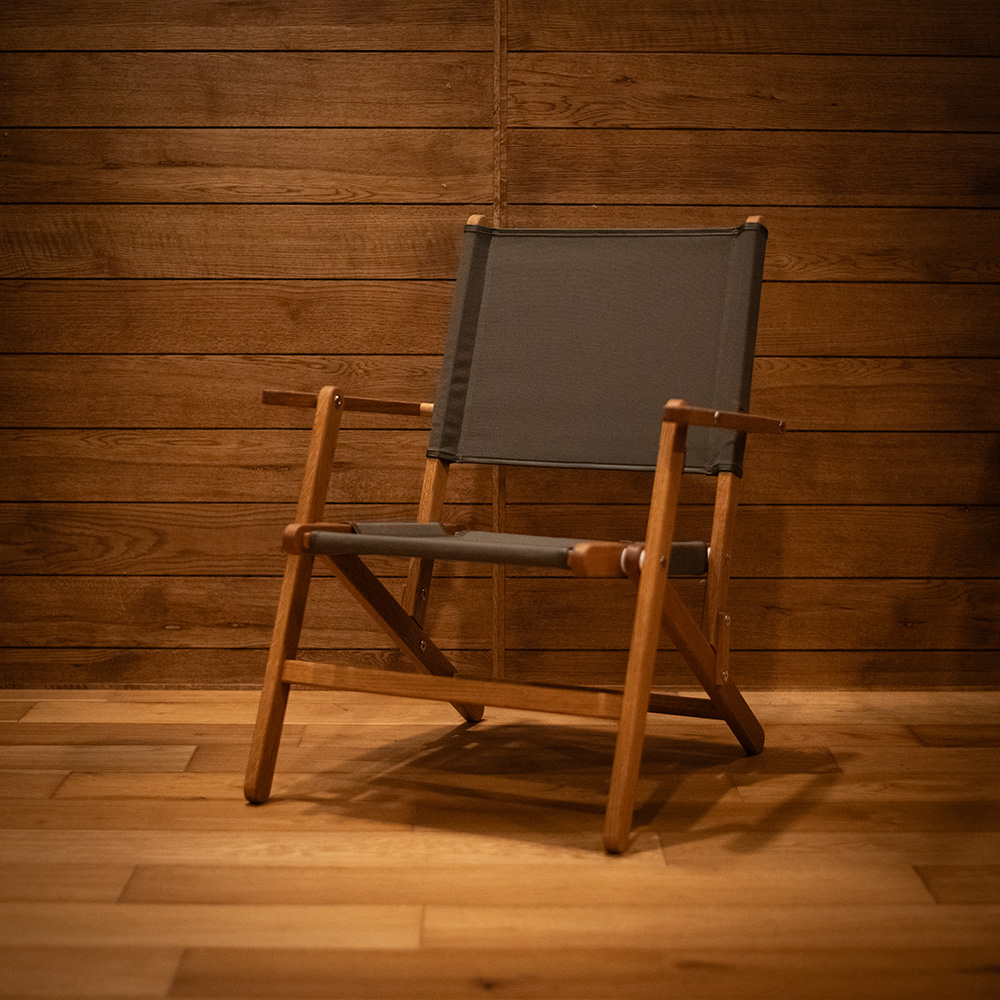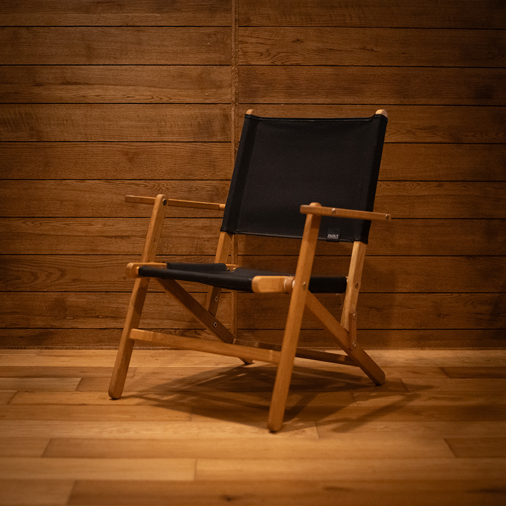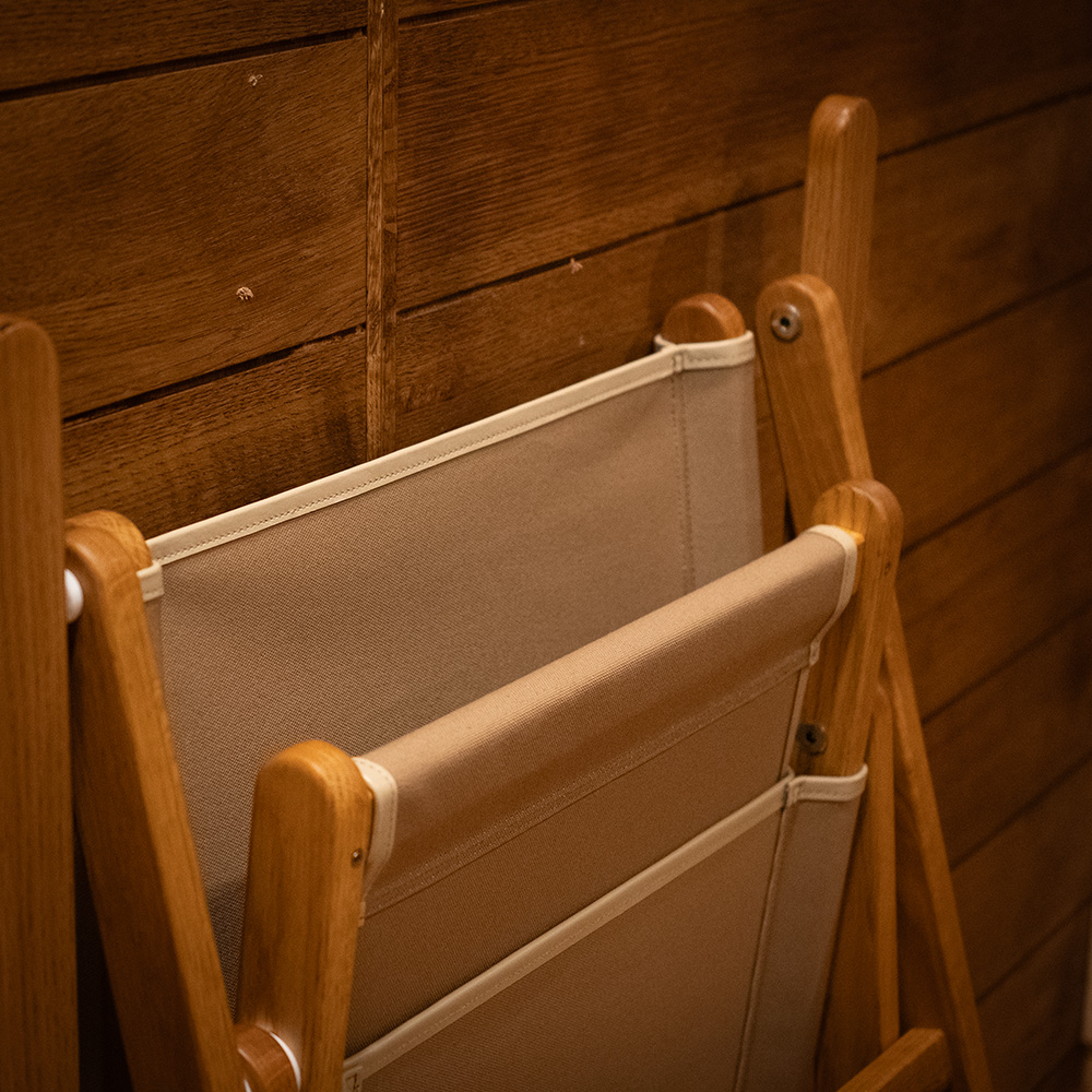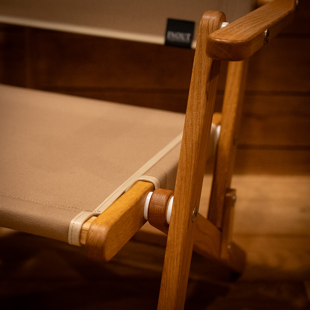 Designed for long, comfortable sitting, the seat height is carefully tuned to reduce fatigue, and the cross-woven upholstery keeps sagging to a minimum. The fabric edge has been upgraded from canvas to leather piping for a more premium feel, and an INOUT metal plate is mounted on the back leg. We use Kurashiki Canvas, known for its toughness and low stretch, so you can enjoy the chair for years.