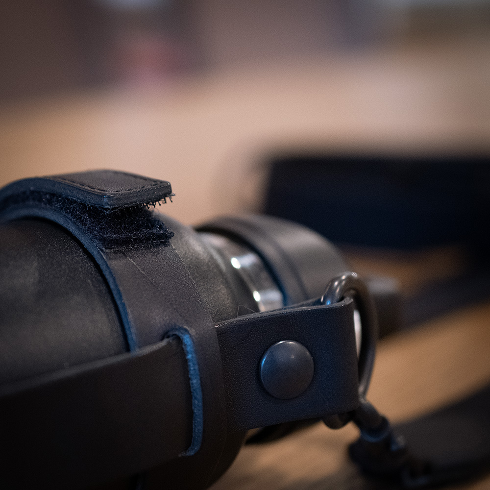 A stylish and functional bottle holder featuring a beautiful combination of black leather and black metal.
