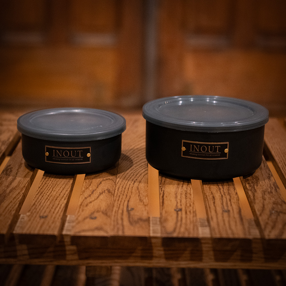 105φ&120φのBlack canister 既存の105φcanisterと新作の120φcanisterがBlackの蓋での登場 半透明の黒い蓋はラグジュアリーな雰囲気を醸し出します。 食品以外にも無くしそうな小さな物など収納としても便利です。 105φのcanisterはINOUTのシェラカップにちょうど入るので持ち運びにも便利。